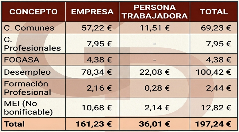 El desglose incluye contingencias comunes, profesionales, Fondo de Garantía Salarial, desempleo, formación profesional y el Mecanismo de Equidad Intergeneracional (MEI).